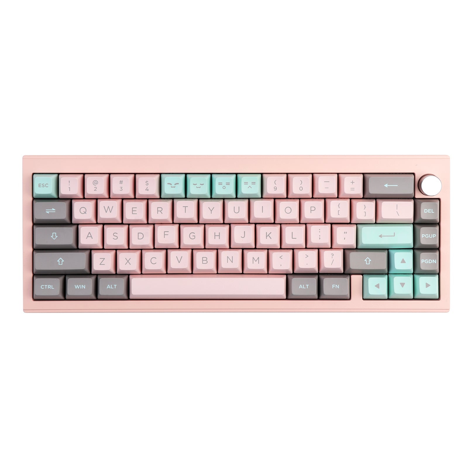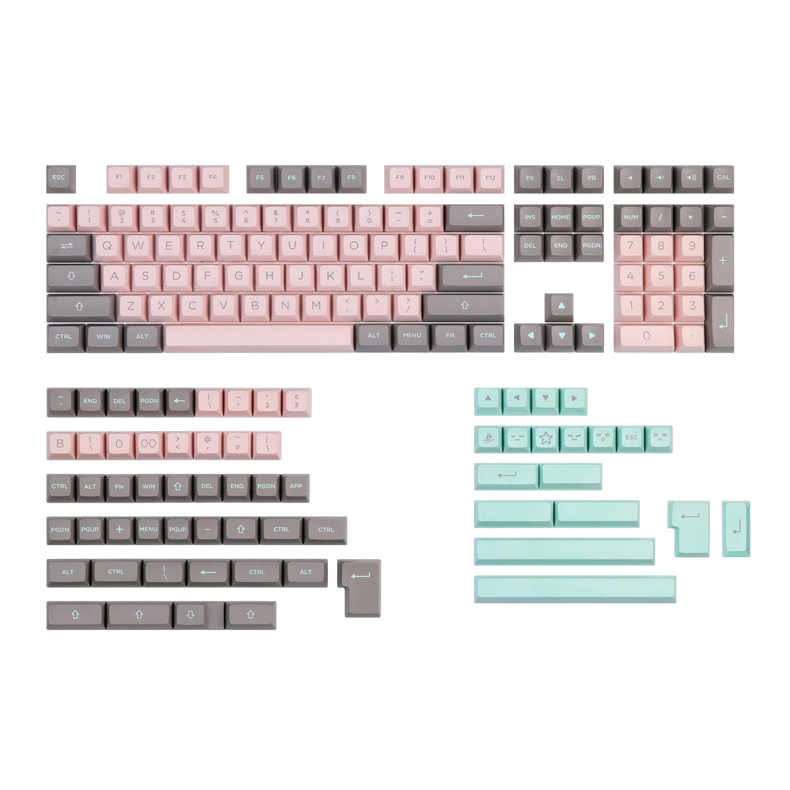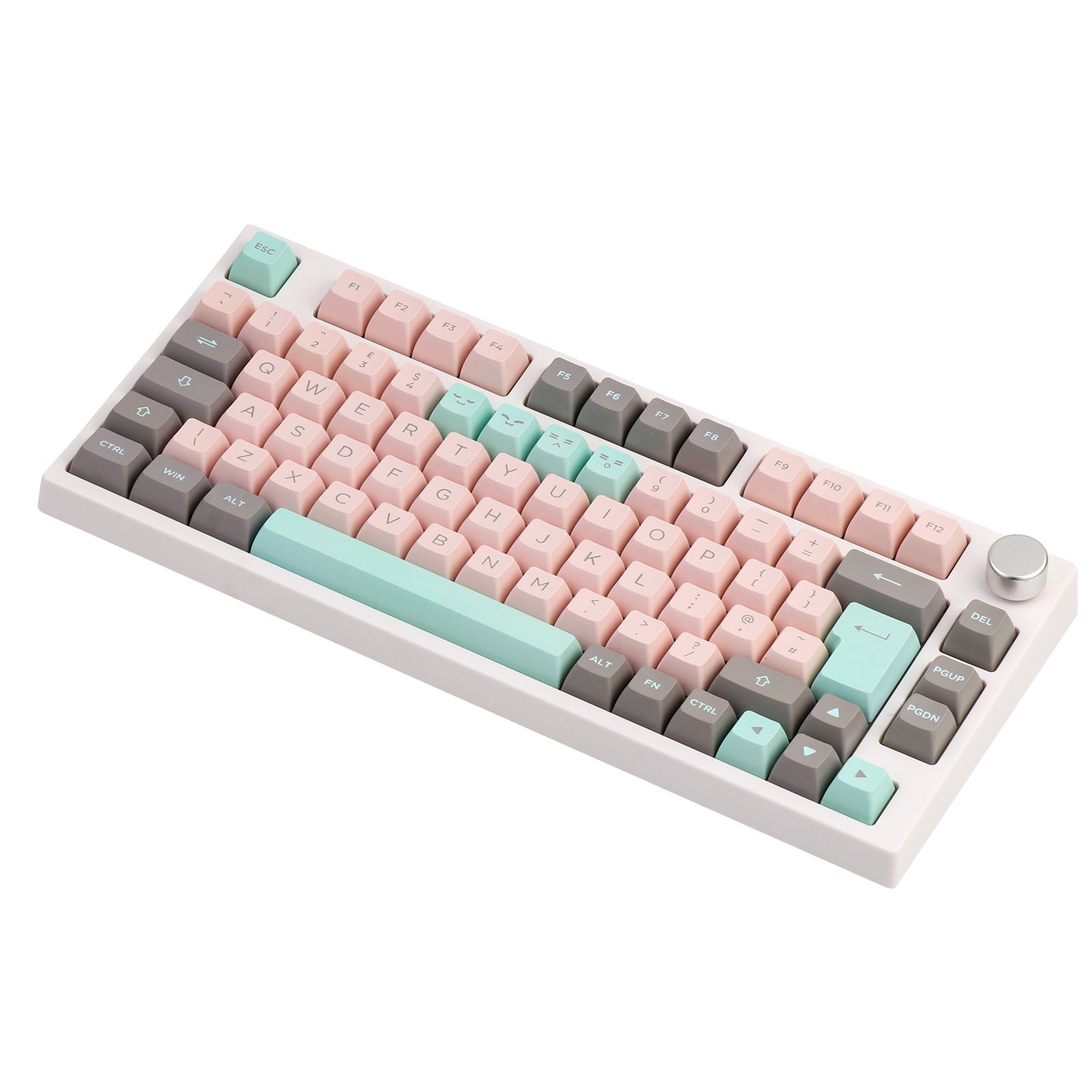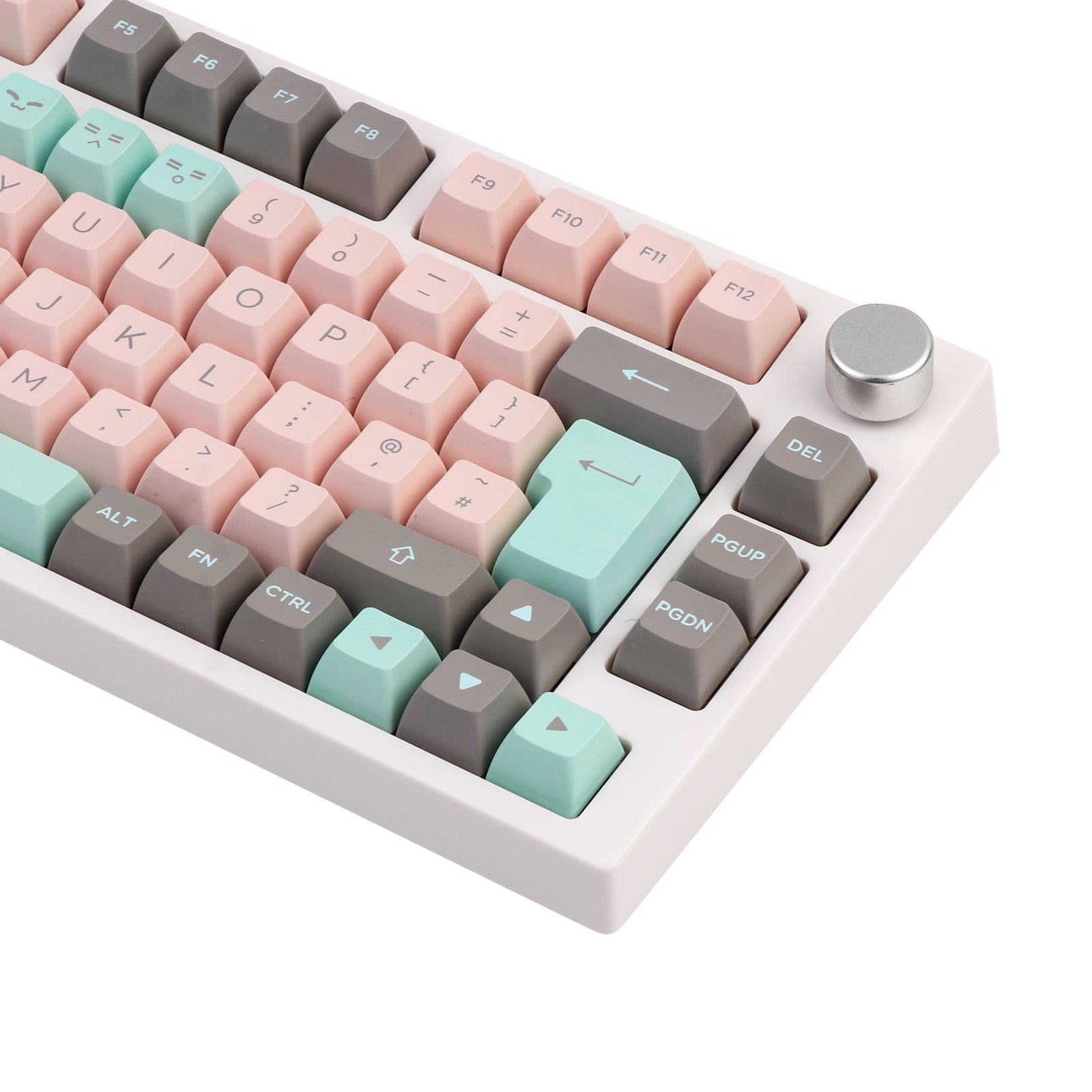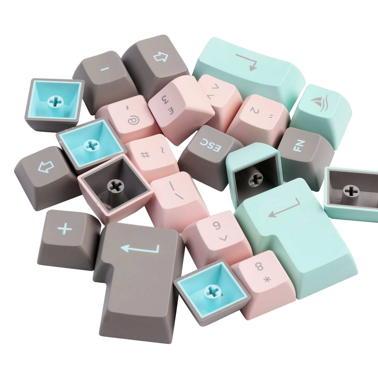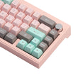 The blushing pink color is such a soft, romantic shade with a warm undertone. In this keycap set, we have adopted the warm tone color to make a suit. With the mint green and grey, Blushing Mint offers a balanced palette that marries the gentle warmth of blushing pink with the cool tranquility of mint green. This color scheme is ideal for creating a calming, serene environment with a hint of vibrant freshness.
