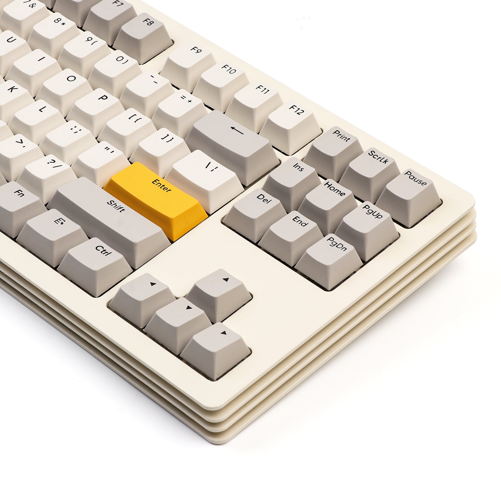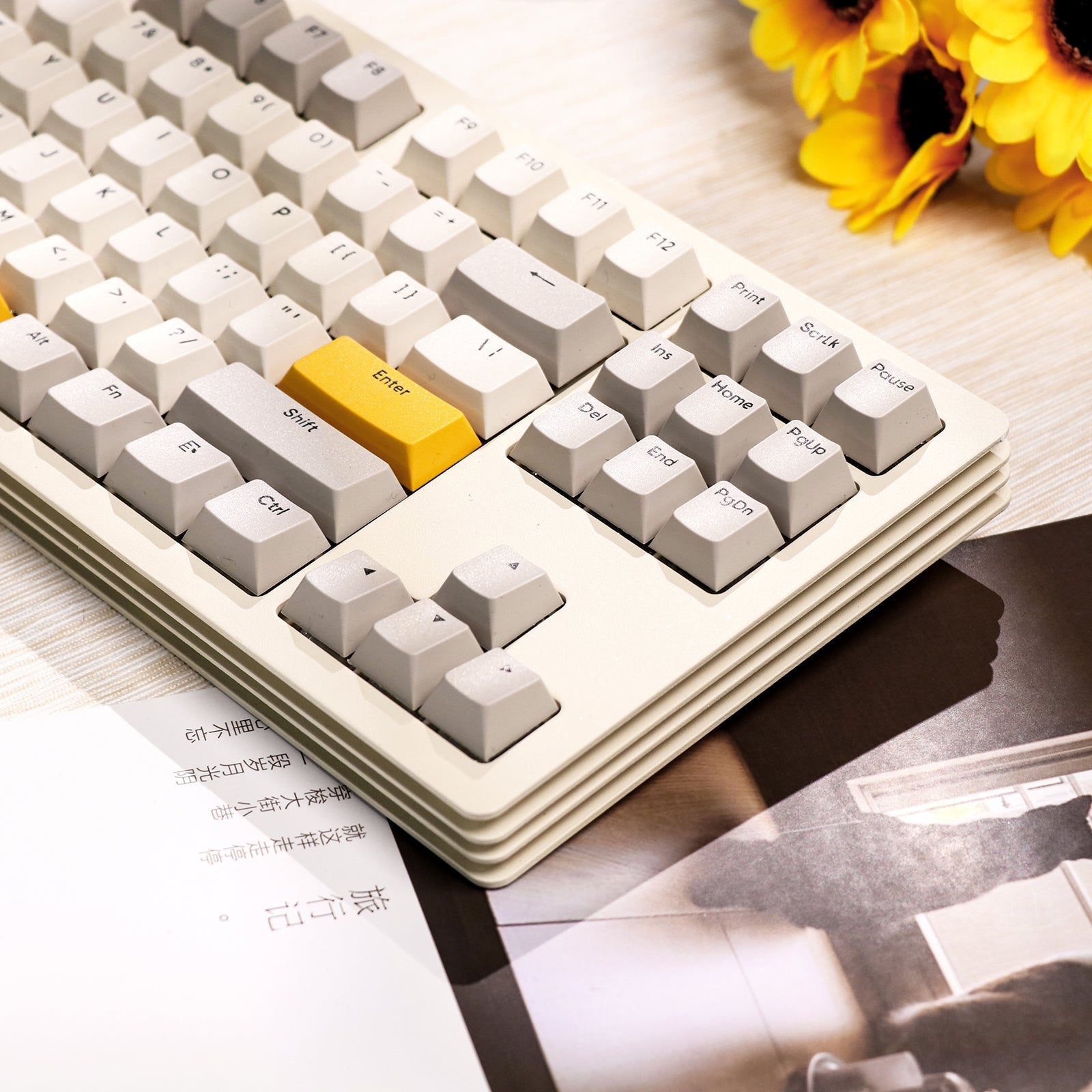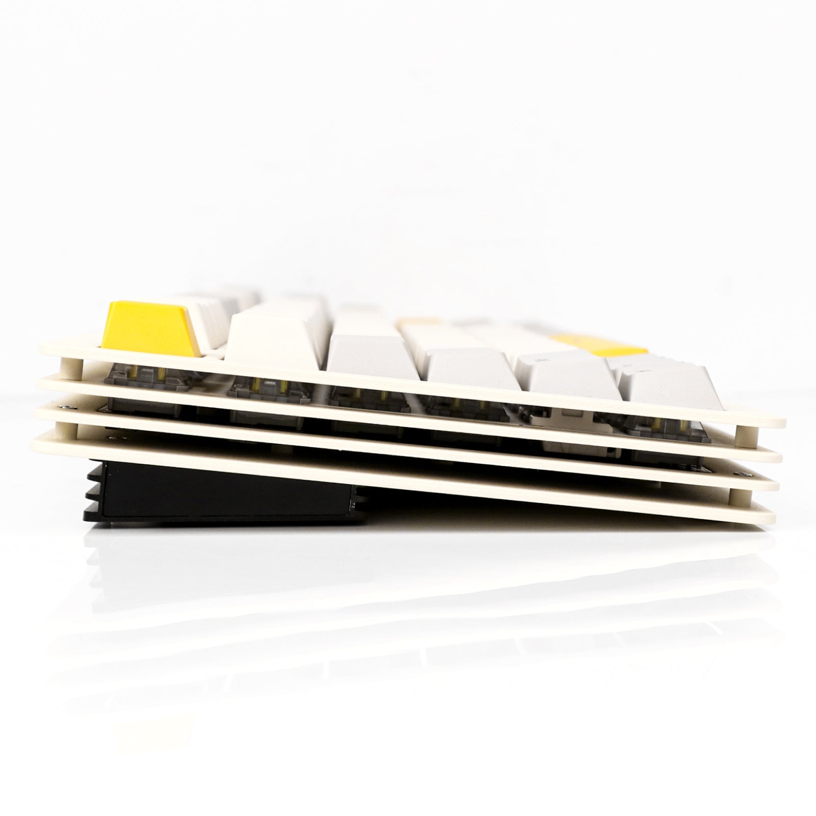 The Ajazz AKC087 is designed in the steel-stacked mount which tends to be easily customized. With this steel stacked mount keyboard, the layers consist of a top plate, a bottom plate, a positioning plate and the PCB internal layer. The plates are made of steel and powder-sprayed for durability and rigidity. The key switches are mounted between the plates, and the layers are held together using screws or standoffs to keep stable.