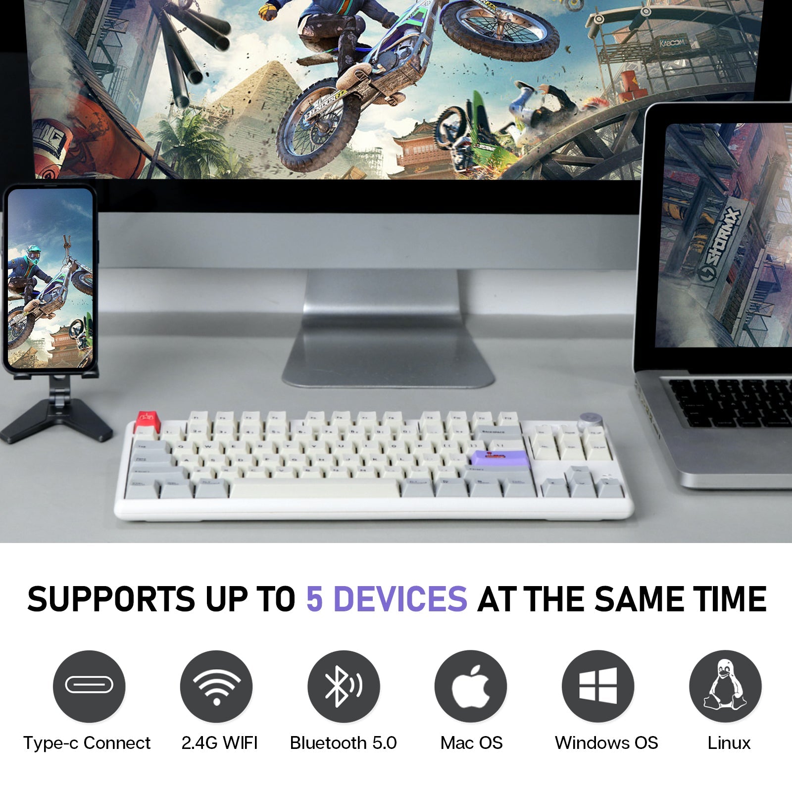 Equipped with the Large Capacity battery, this keyboard supports wireless and wired connections. By the wireless option, either Bluetooth (up to 5.0) or 2.4GHz can be chosen, and the polling rate can be up to 1000hz with 2.4GHz. By the wired mode, macro can be programmed to better fit your typing habits. The modes can be easily switched by shortcuts.