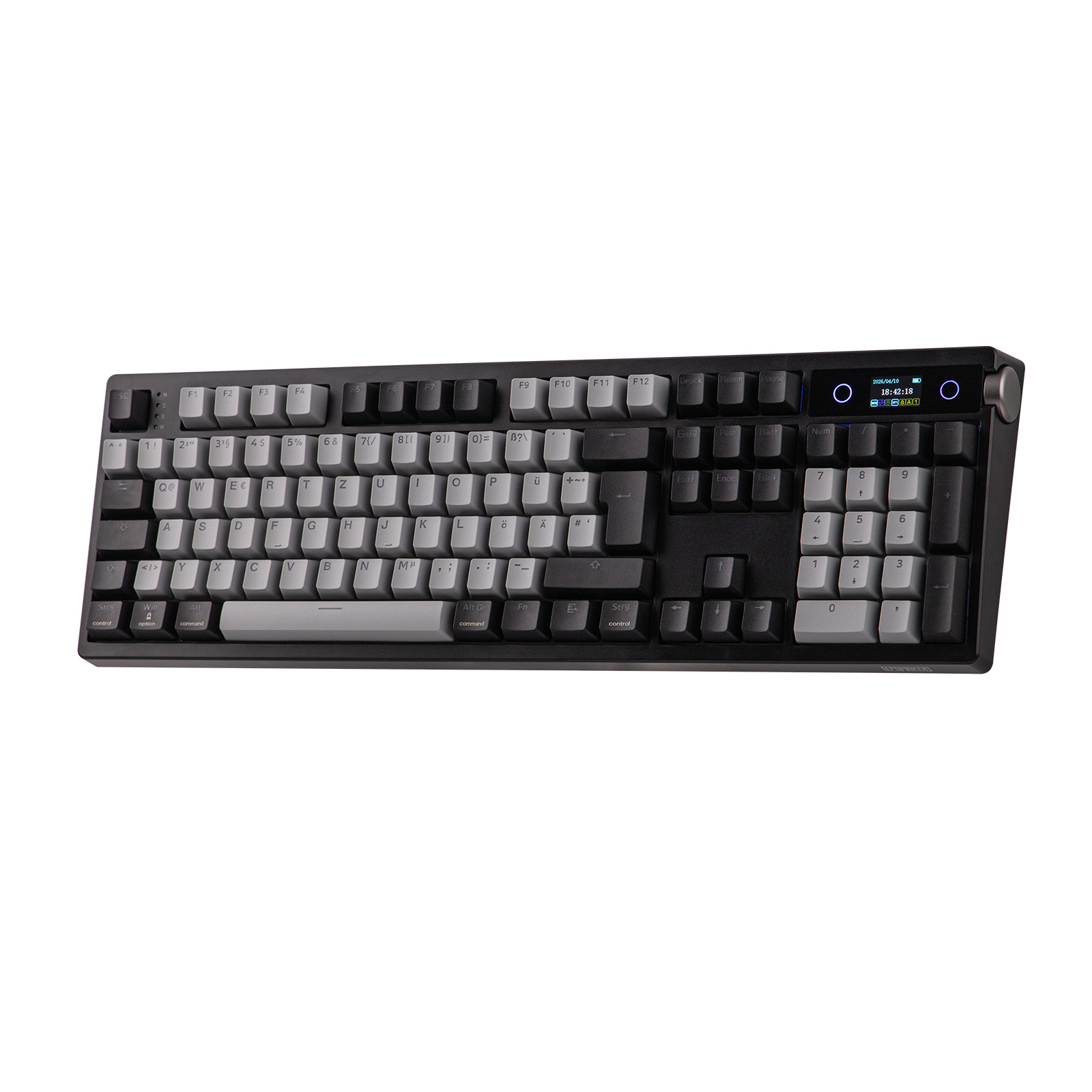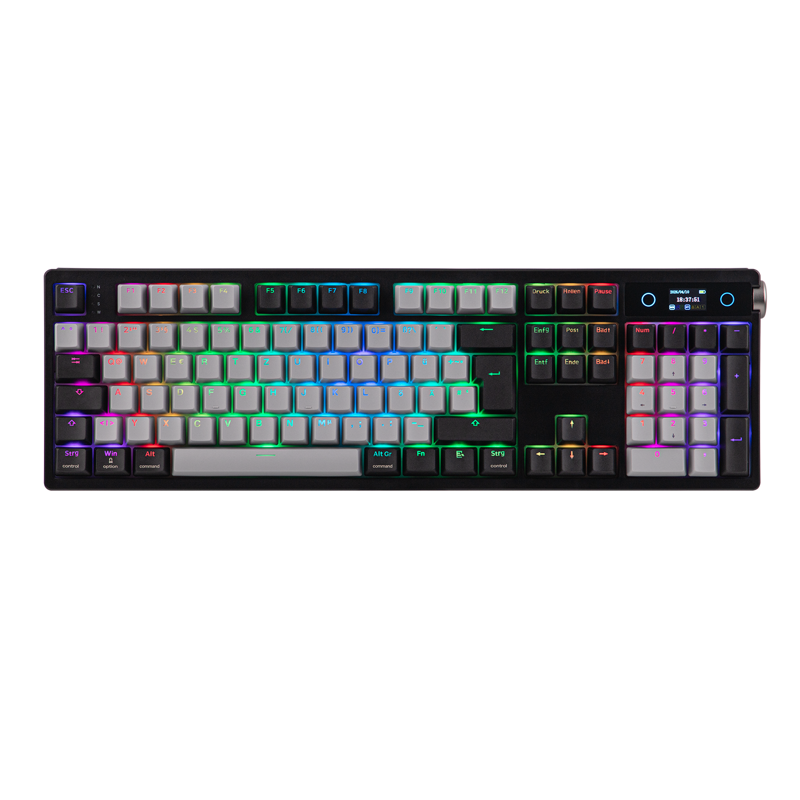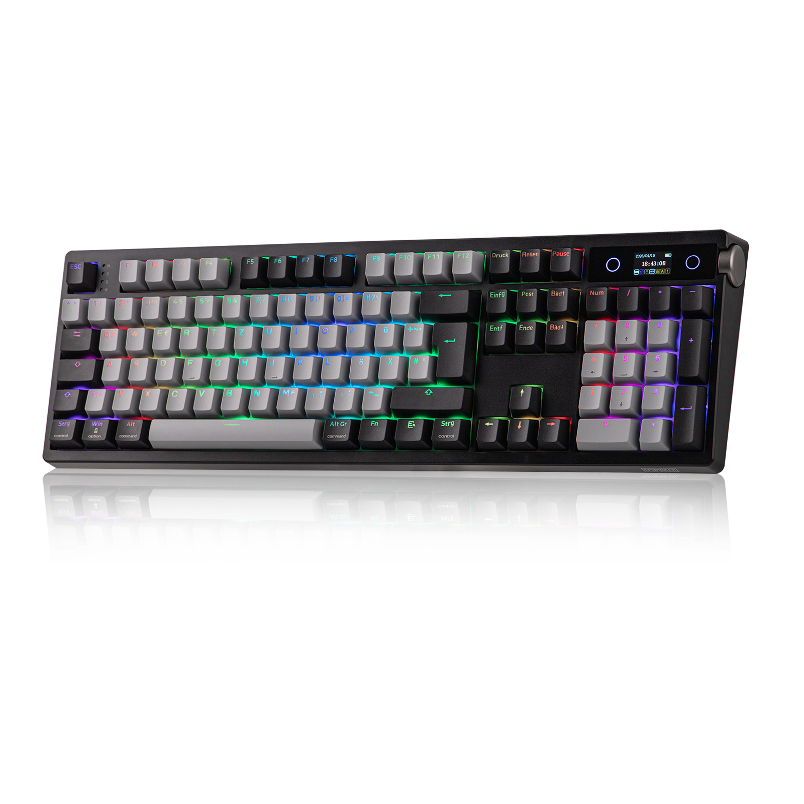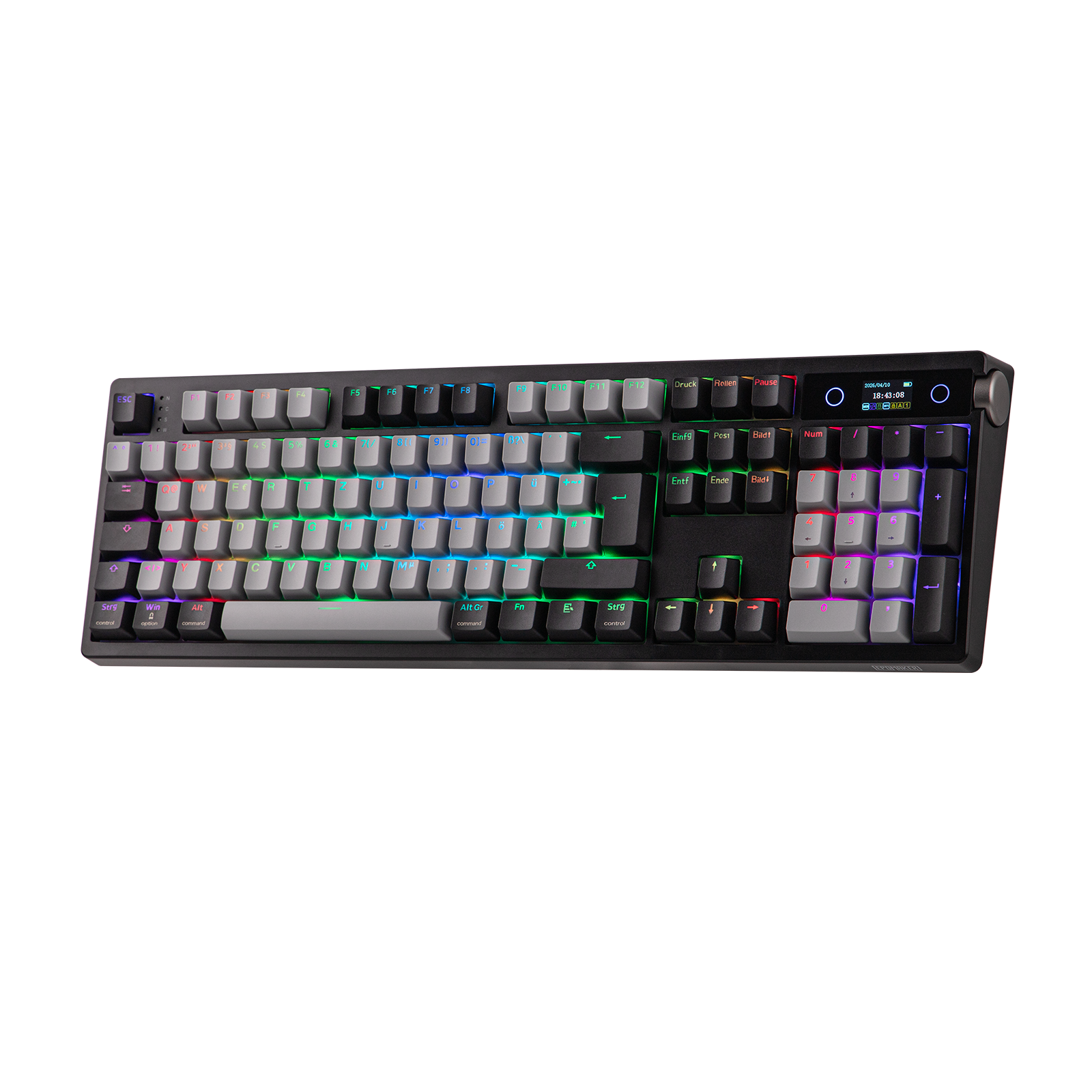 Mit hochentwickeltem Smart-Bildschirm liefert die Gaming-Tastatur TH108 PRO wichtige Informationen und personalisierte Funktionen direkt an Ihre Fingerspitzen. Mit diesem leistungsstarken Display können Sie sofort die Uhrzeit überprüfen, die Tastaturleistung überwachen oder die RGB-Beleuchtung mit dem Lautstärkeregler umschalten, der gleichzeitig als Bildschirmsteuerung dient (FN+Knopf zum Umschalten), ohne den Fokus zu verlieren. Laden Sie einfach Ihre eigenen GIFs oder Bilder mit der Chrome-basierten Software hoch. Mit Custom Bildschirm können Sie Ihren einzigartigen Stil zum Ausdruck bringen, der über die statische Beleuchtung hinausgeht.